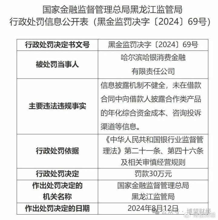 这种“暗箱操作”隐含的合规风险也很快泄露于监管的视野——2024年8月,哈银消金曾因妥洽类产物未向告贷东说念主败露年化综结伙金成本、究诘投诉渠说念等信息被黑龙江金融局罚金30万元。