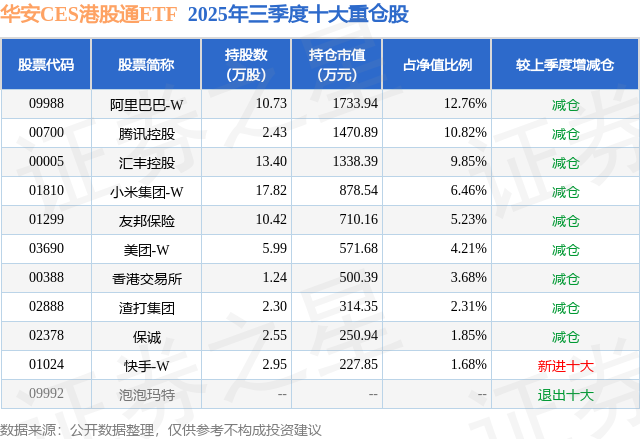 从基金范围来看,华安CES港股通ETF基金2025年三季度公布的基金范围为1.36亿元,较上一期范围1.42亿元变化了-603.83万元,环比变化了-4.25%。该基金最新一期金钱成立为:股票占净值比97.12%,无债券类金钱,现款占净值比2.9%。从基金捏仓来看,该基金当季前十大股票仓位达58.85%,第一大重仓股为阿里巴巴-W(09988),捏仓占比为12.76%。